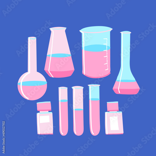 Vector set of abstract chemical flasks and bottles isolated on blue background