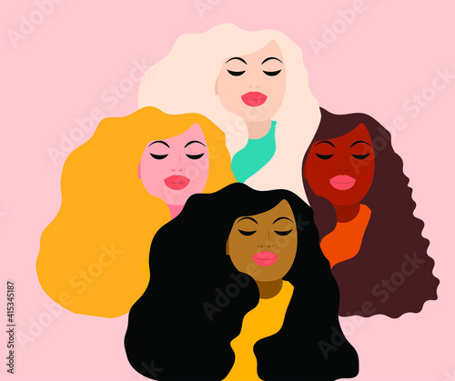 vector with faces of women of different skin colors. flat image of women's day greeting card. equality of women