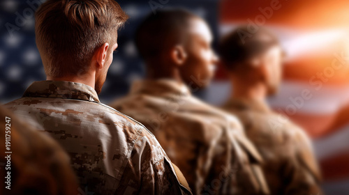 Veterans standing in solidarity with large American flag background, showcasing unity and patriotism, moment of reflection and pride, military camaraderie, defocused flag, with copy space