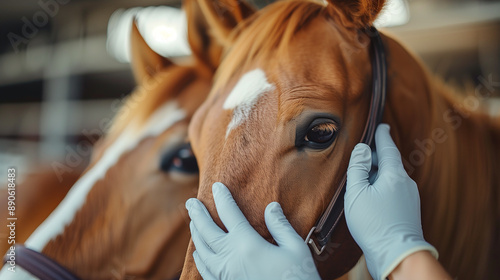 veterinarian examines eyes of bay horse, pupil, iris, cornea, veterinary ophthalmology, diseases, diagnosis, treatment. Banner copy space