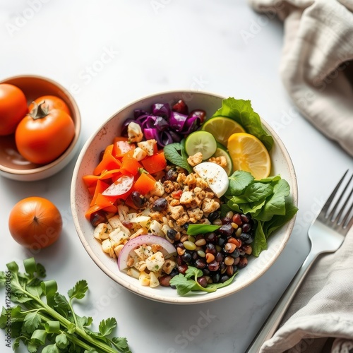 Vibrant and Nutritious Grain Bowl Featuring Colorful Vegetables and Fresh Herbs Nearby