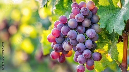 Vibrant bunch of ripe grapes hanging on a vine in a sunlit vineyard showcasing rich colors and lush green leaves.