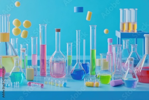 Vibrant Chemistry Lab Setup: Colorful Substances in Glassware on a Blue Background for Scientific Exploration