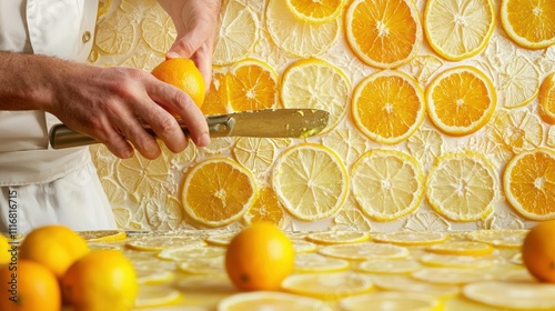 Vibrant citrus slice patterns create a stunning backdrop for kitchen photography art