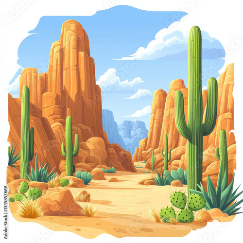 vibrant desert landscape illustration with tall cacti, rocky formations, and clear blue sky, Isolated design on white background