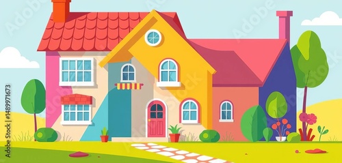 Vibrant flat-style illustration of a whimsical, colorful house with geometric shapes, geometric, cartoon