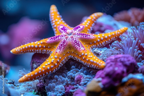 vibrant marine life exotic fromia seastar amid colorful coral reef iridescent hues pop against azure water underwater macro photography in aquarium setting