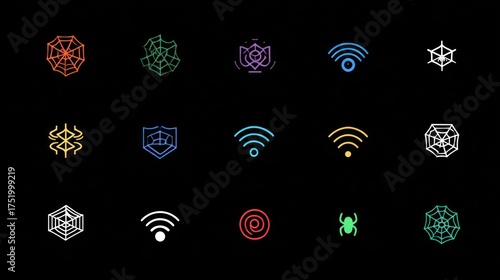 Vibrant Neon Icons: Spiders, Webs, Wi-Fi, and Shield Symbols on Black Background