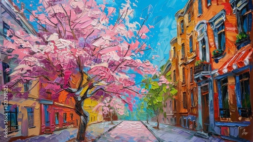 Vibrant Painting of Blossom Tree on City Street