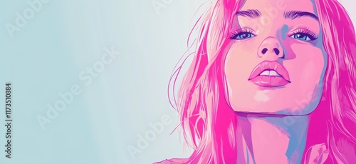 Vibrant Pink Portrait of a Young Woman with Striking Features and Bold Colors, copy space for text