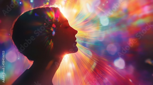 Vibrant silhouette radiating dynamic bokeh with a spectrum of rainbow hues celebrating joy and creativity