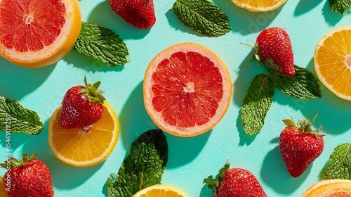 Vibrant Summer Fruit Citrus Slices Strawberries Mint Leaves Flatlay Photography Background Design Image Tasty Fresh Red Orange Green Healthy Food Delicious diet ripe juicy macro