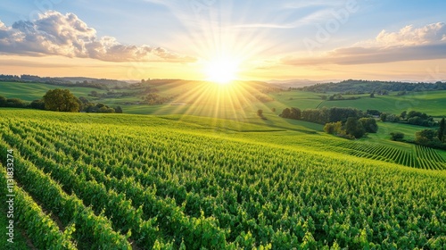 Vibrant sunrise over lush vineyards rolling hills landscape photography natural scenery aerial view serenity and growth