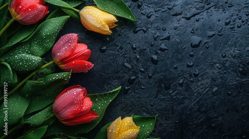 Vibrant tulip bouquet in red and yellow with raindrops on dark stone surface and lush green leaves with blank space for text observations