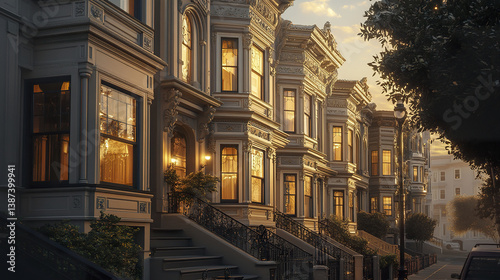 Victorian townhouses with intricate bay windows at sunset