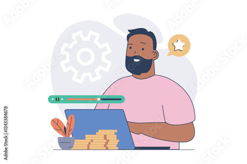 Video marketing concept with cartoon people in flat design for web. Man creating content with product promotion messages, attracting new audience and earning financial profit. Vector illustration.