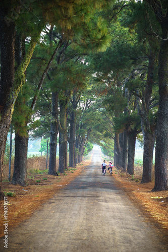 Vietnam countryside landscape with children cycling to school on soild road along lines of tree.