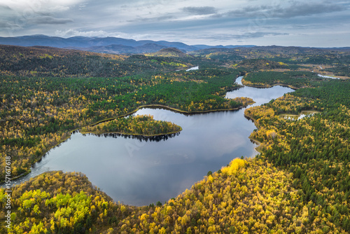 View of a serene lake mirroring the sky amidst the colorful autumn foliage and distant mountains, a tranquil landscape, Karigasniemi, Lapland, Finland.