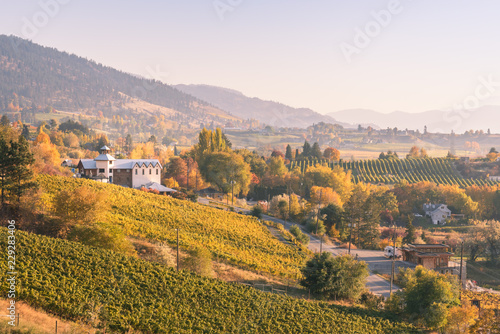 View of vineyards and wineries on the Naramata Bench at sunset in autumn