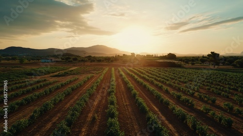 Vineyard rows stretching towards the horizon at sunset in countryside