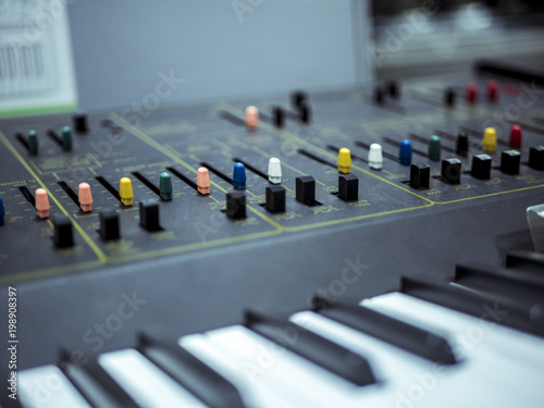 vintage analig synthesizer with piano keys close up