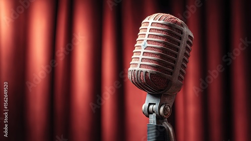 Vintage dynamic microphone glowing under red velvet curtain folds, bold wallpaper design for stand-up comedy open mic night
