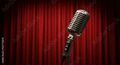 Vintage microphone on stage illuminated by spotlight, symbolizing performance arts tradition for comedy show, stand up night, concert or karaoke event background