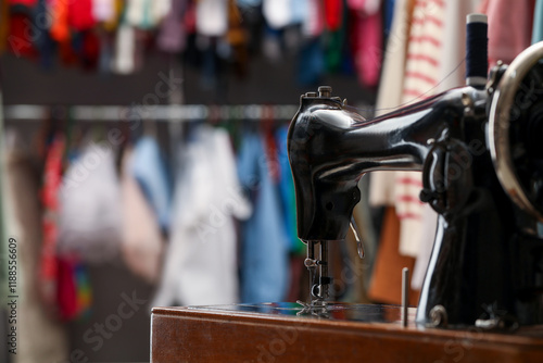 Vintage sewing machine with thread in workshop, closeup. Space for text