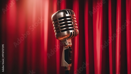 Vintage silver microphone centered on a black stand with red pleated stage curtains as a backdrop. Perfect for performance or theater-related imagery.
