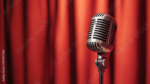 Vintage Stage Presence: Microphone Highlighted by Dramatic Red Curtain