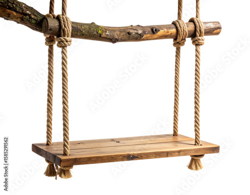 Vintage Wooden Rope Swing Hanging from Tree Branch, Isolated on White PNG