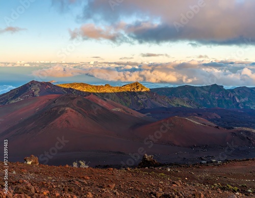 Volcanic landscape bathed in sunrise light, showing diverse crater formations and cloud layers