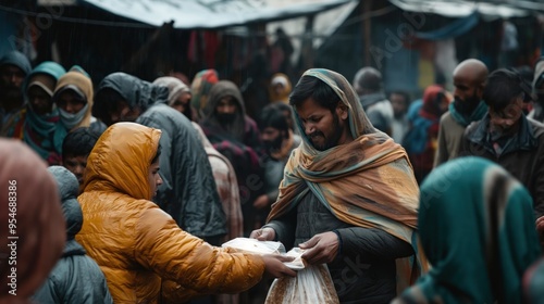 Volunteers distributing food and blankets to refugees in a crowded camp, expressions of gratitude and relief, sense of humanitarian aid and support, diverse group receiving essential supplies