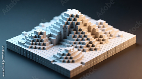Voxel topographic 3D form built from small extruded blocks modern computational generative design aesthetic