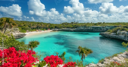 Vue magnifique d'un lagon paradisiaque aux eaux turquoises cristallines avec des fleurs rouges au premier plan et un ciel bleu avec nuages en arrière-plan.