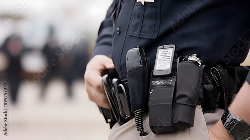Walkie Talkie Attached to Police Officer s Uniform Belt Receiving a Real Time Message During an Active Field or Law Enforcement Mission
