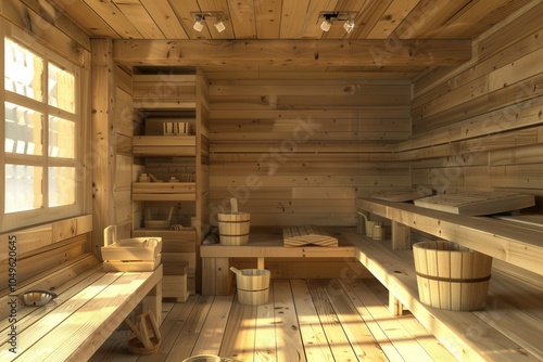 Warm wooden tones create a tranquil atmosphere in the traditional sauna, adorned with benches, buckets, and shelves for relaxation. Generative AI