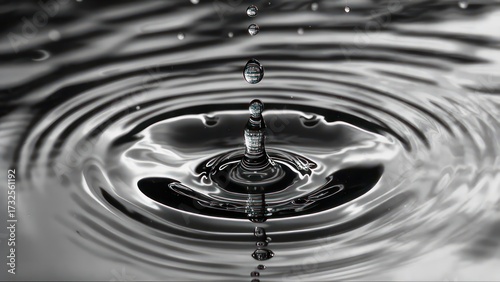 Water droplet impact creating ripples in liquid surface, monochrome photography.