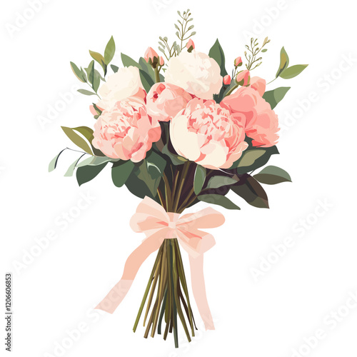 Wedding peony flowers bouquet with paper wrap and bow tired art illustration peonies vector