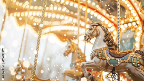 Whimsical image of an amusement park carousel, with ornate horses and decorative lights against a pristine white background