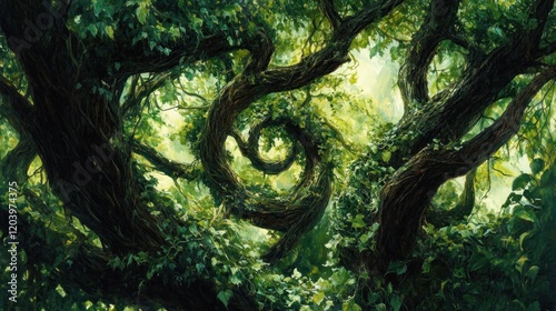 Whimsical Trees with Spiraling Branches in a Lush Green Forest Painting
