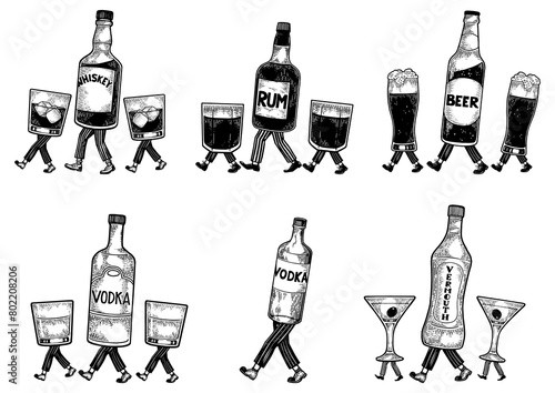 Whiskey beer vodka alcohol vermouth bottle with ice and glasses walks on its feet sketch engraving PNG illustration. Scratch board style imitation. Black and white hand drawn image.