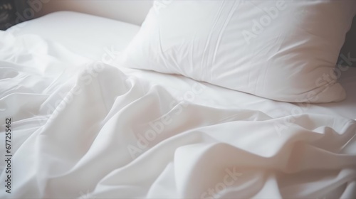 White bedding sheets and pillow background Messy bed concept created with technology