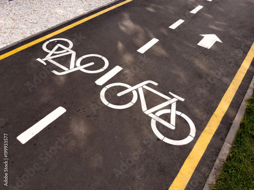 White bicycle sign with arrow on the asphalt, bike road sign on the street, bicycle lane sign on street, gray background