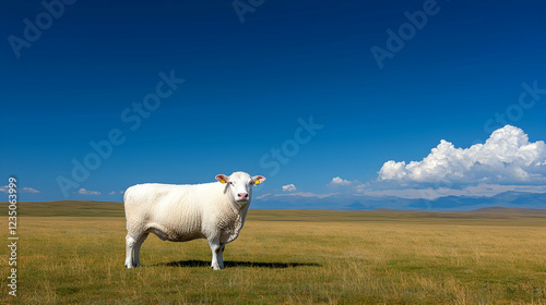 White cow in a grassy field, clear sky, mountains background, livestock farming