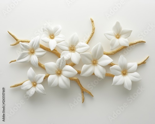 White Delicate Floral Arrangement on Golden Branches, Bright Natural Light, Isolated Background