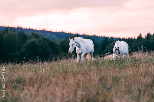 White horses on grazing on a meadow in the morning light