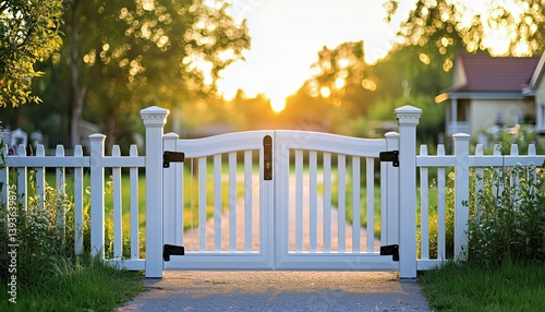 White picket gate open towards a sunlit pathway in a residential area during golden hour