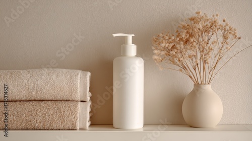 White Pump Bottle and Towels on Beige Shelf with Minimalist Decor.