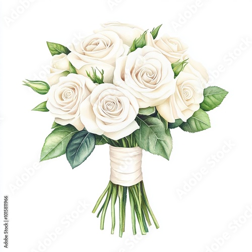 White rose bouquet with green leaves on white background Watercolor illustration.